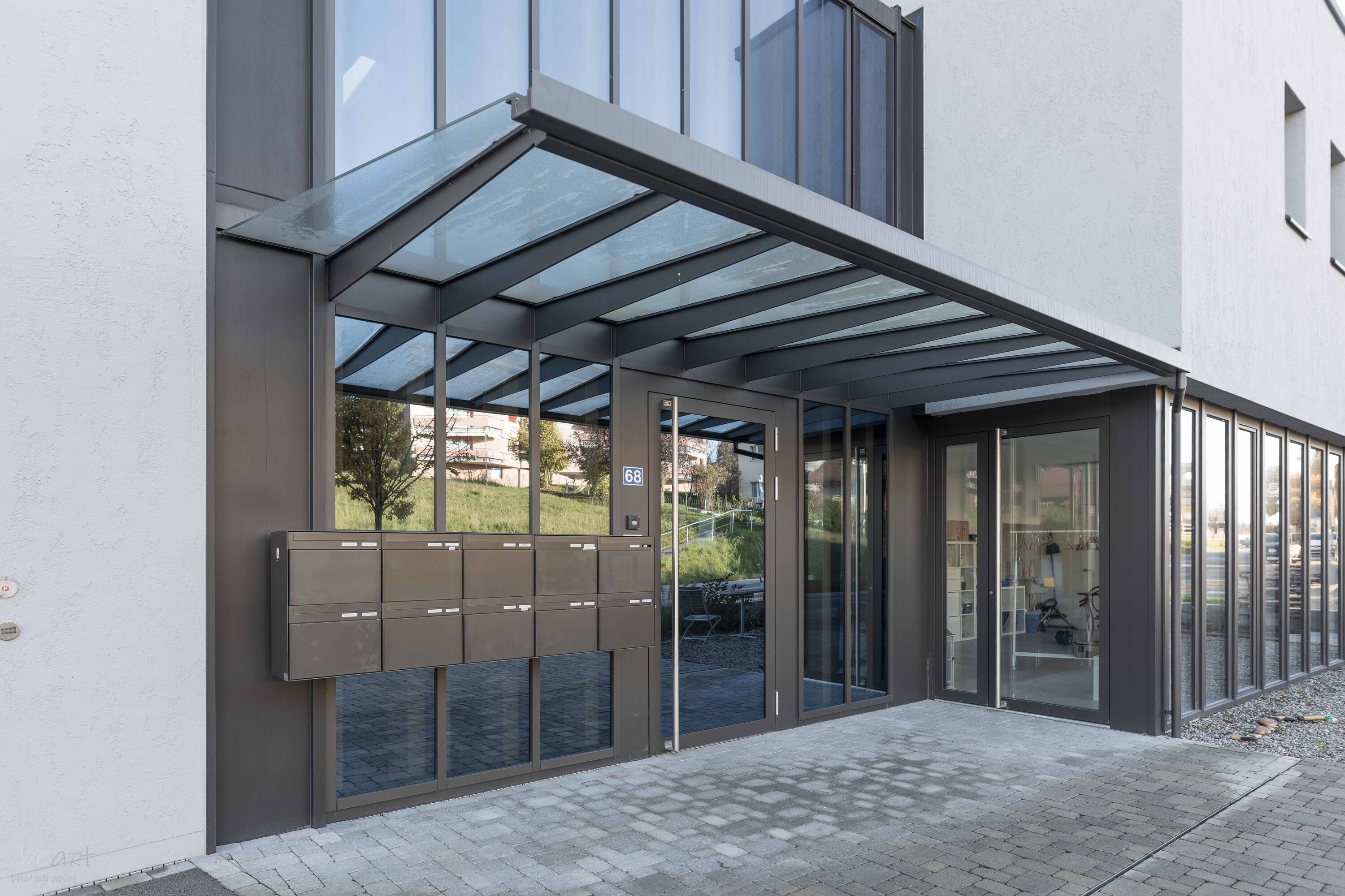 - Glasvordächer an Wand befestigt und auf Stützen aufgelagert