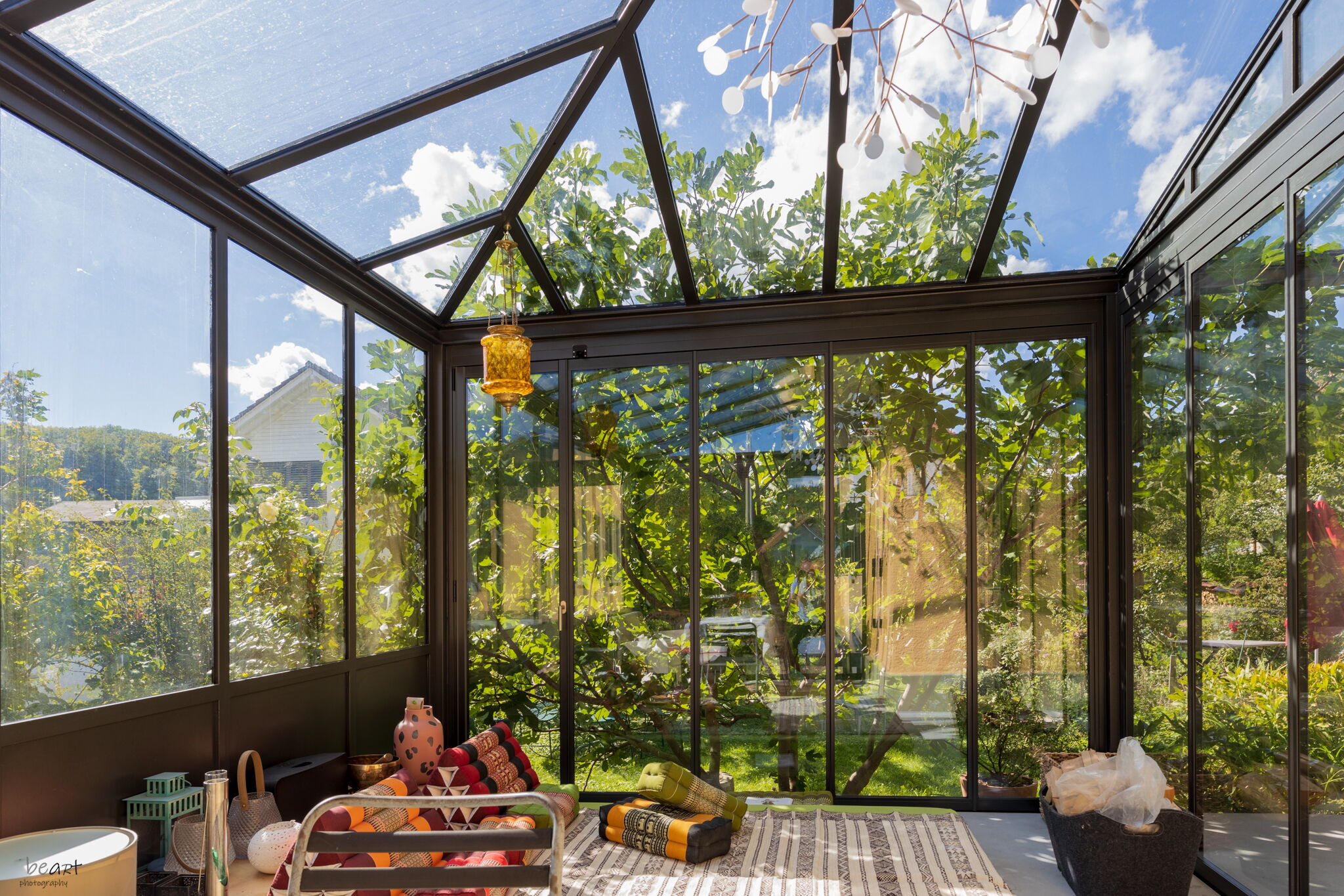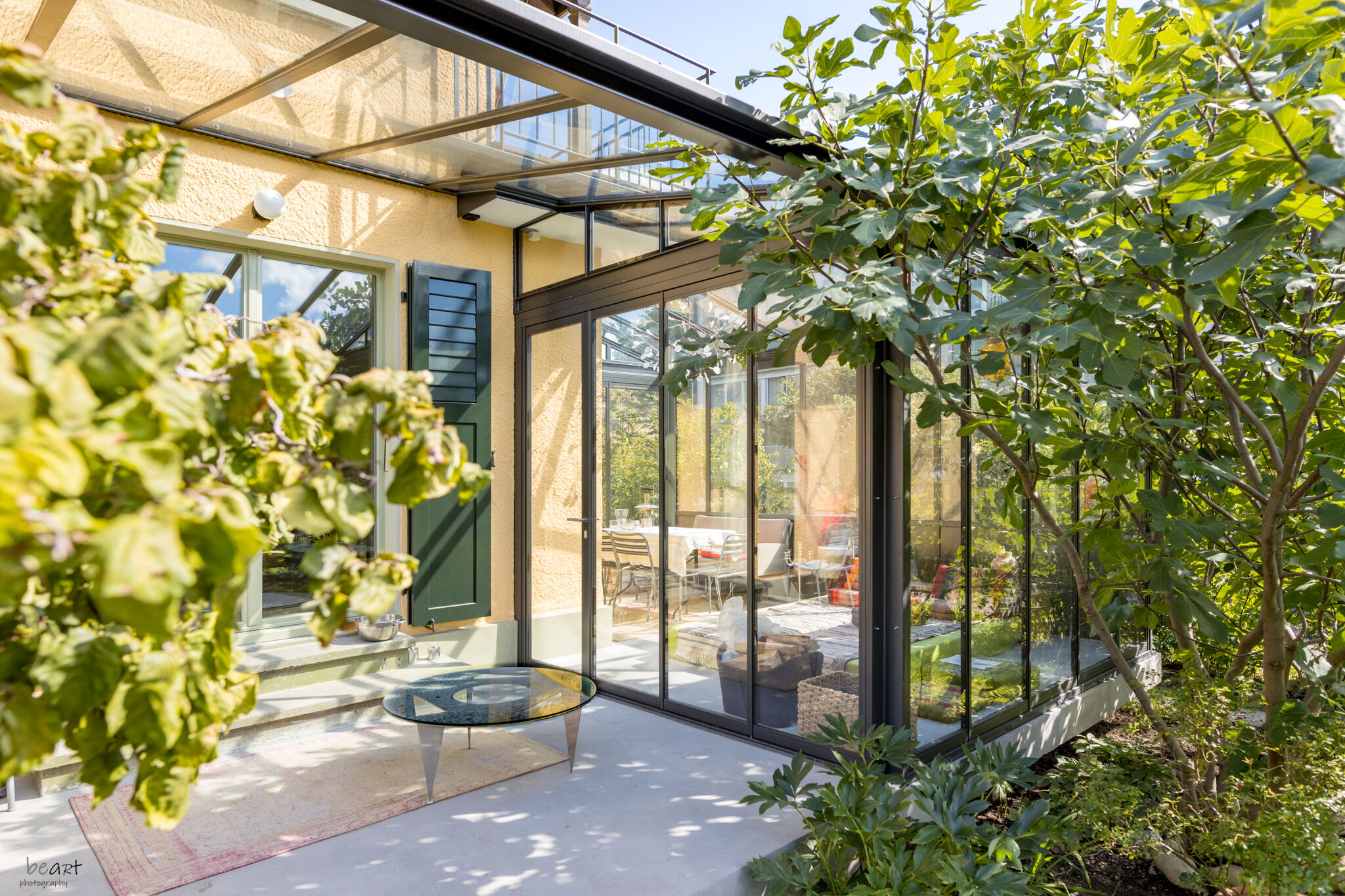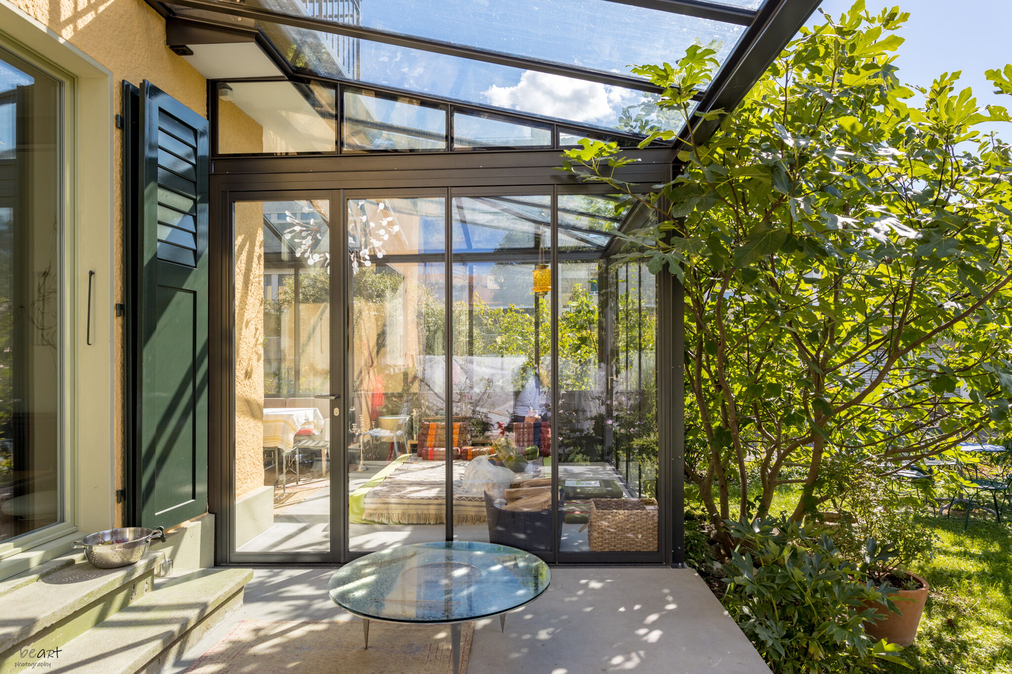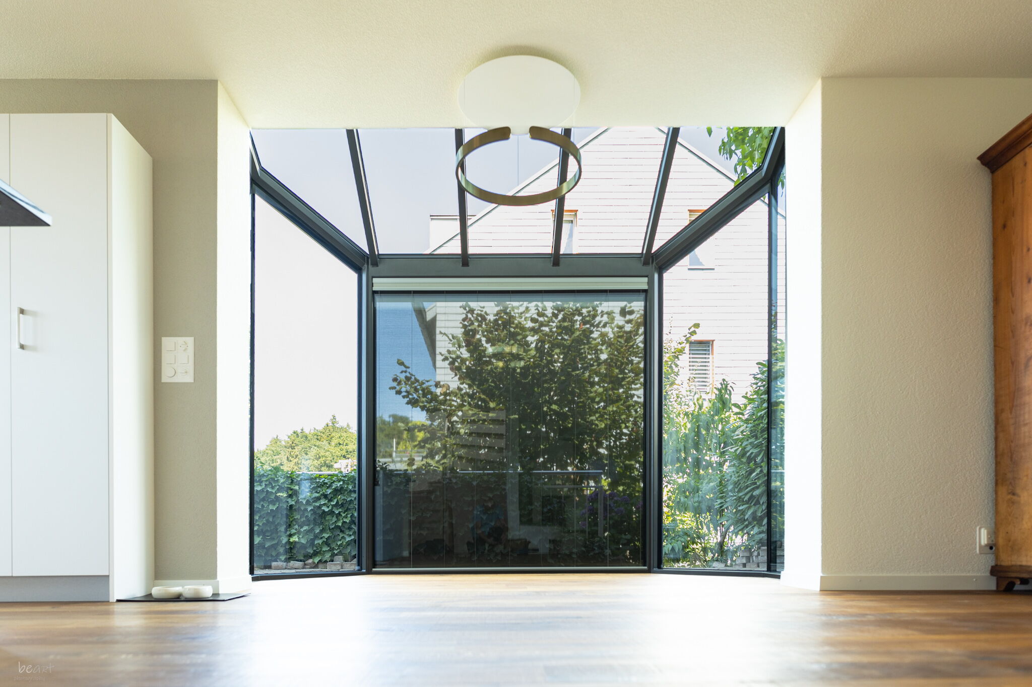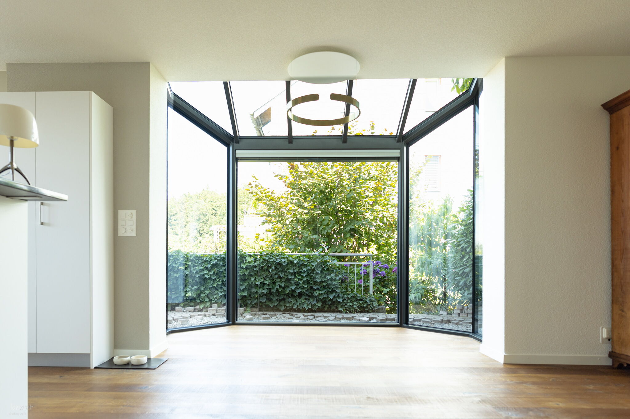 Wintergarten als erweiterter Wohnraum, grosszügige, schwellenlose Hebe-Schiebefenster