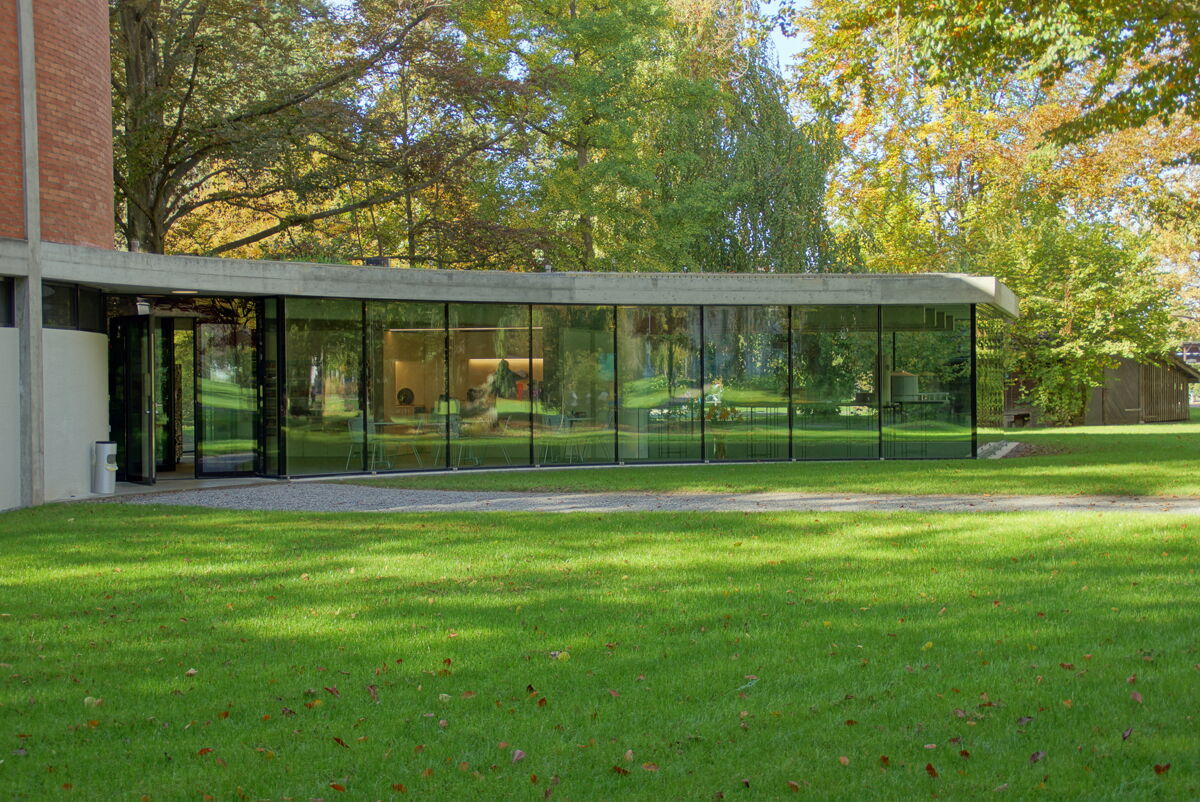 Pfosten-Riegelsystem als Eigenentwicklung, mit erhöhten ästhetischen Anforderungen. Die ebenfalls durch uns hergestellte, abgehängte Decke, fluchtet genau mit dem Fassadensystem.