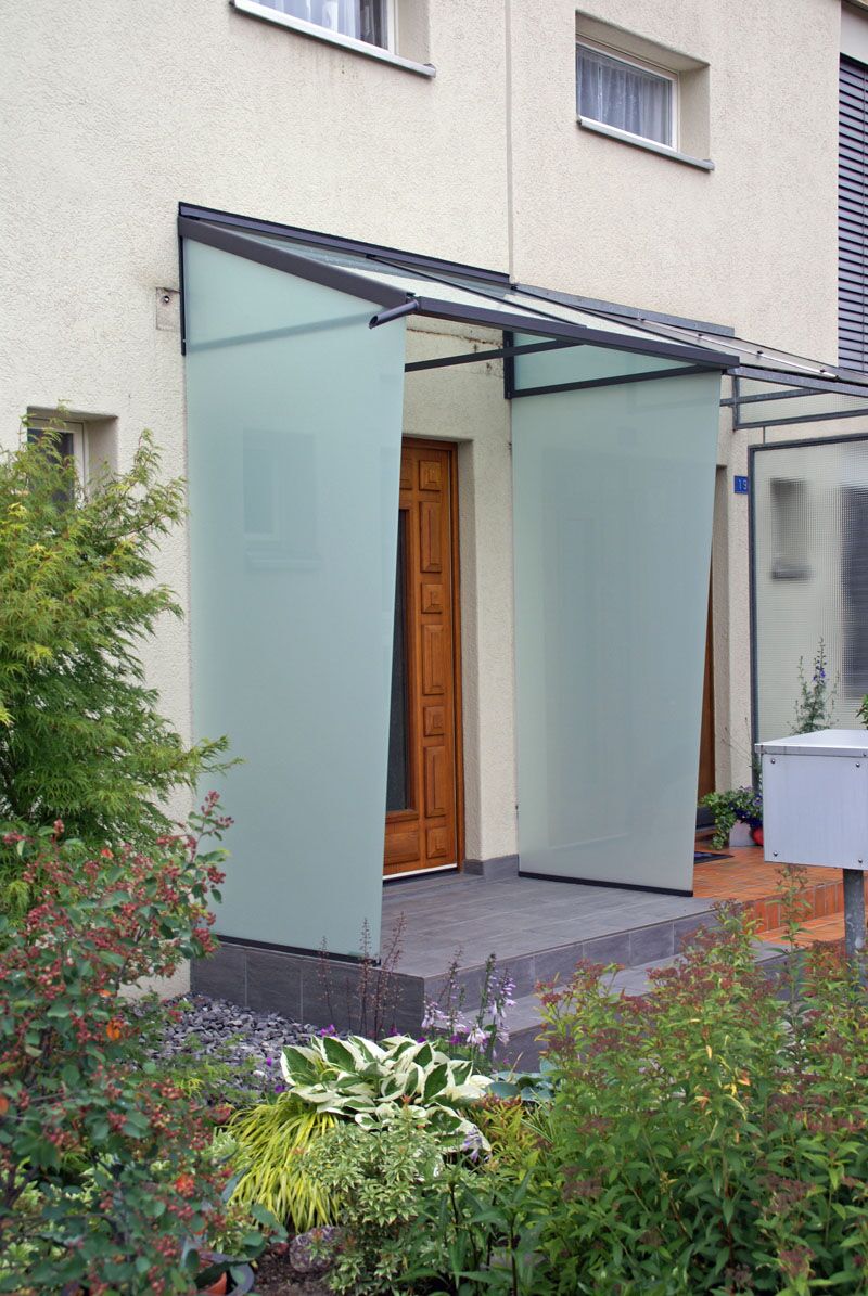 - Glasvordächer an Wand befestigt und auf Stützen aufgelagert