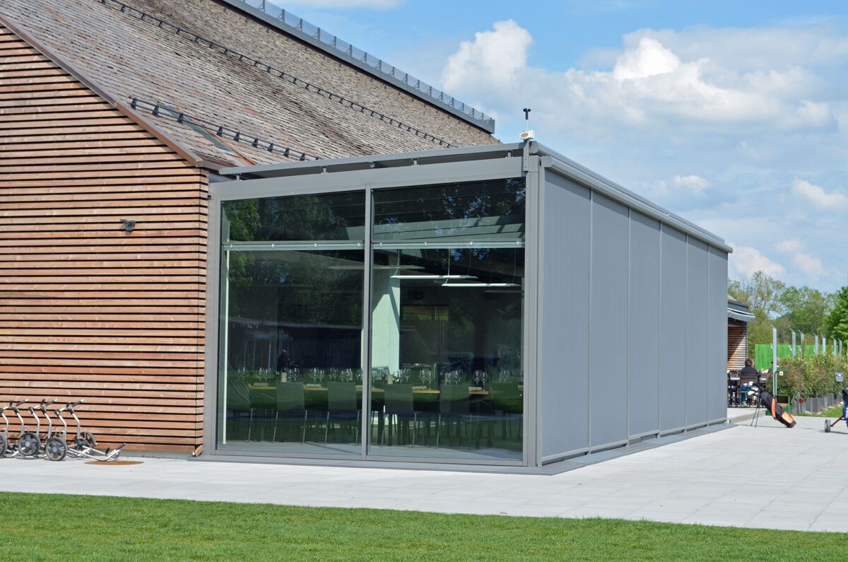 - Eingesetzt werden Dachbeschattungen und Vertikalbeschattungen der Schweizer Marke Stobag